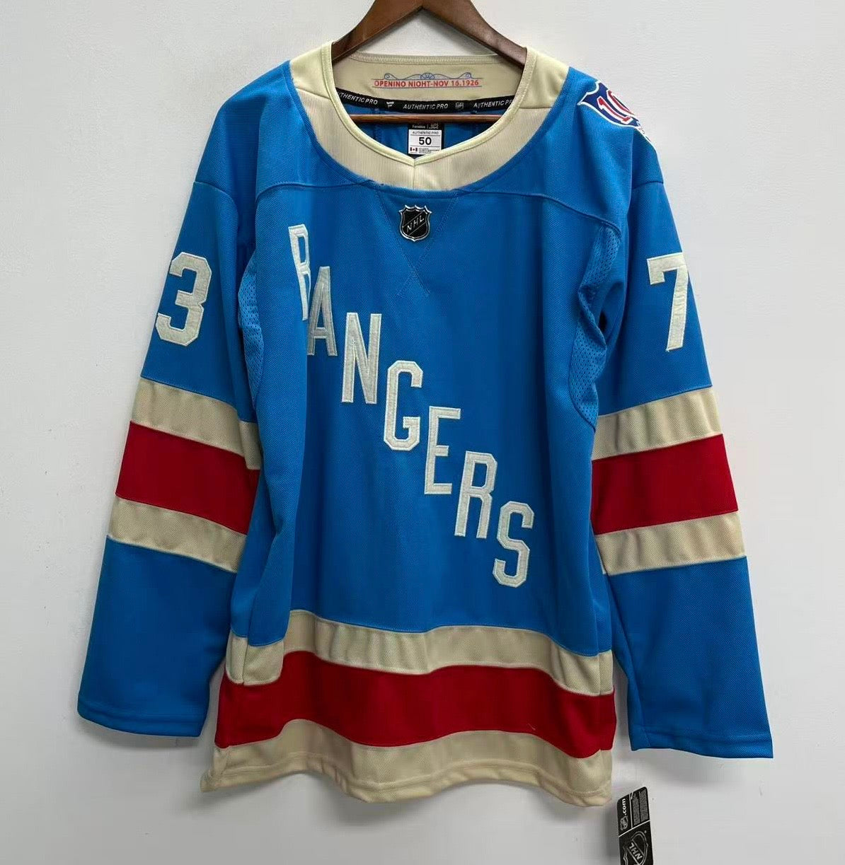 Over the course of a century, the Rangers jersey has undergone several alterations, but the original spirit has endured. In honor of the franchise's Centennial season, the Rangers organization pays tribute to the original Blueshirt with its Centennial jersey, which will be worn on select occasions in 2025-26. The base color and lettering are modeled off the sweater the Rangers wore in their inaugural season, demonstrating how the team's uniform has become a timeless classic.