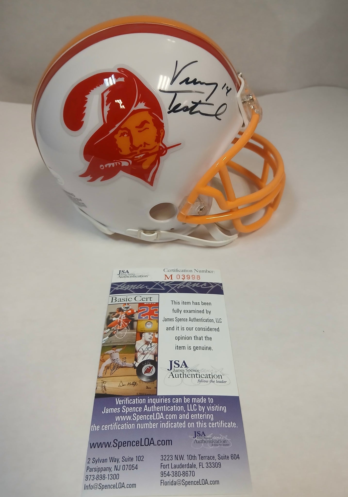 Vinny Testaverde autographed Tampa Bay Buccaneers Mini Helmet … it comes with a JSA COA …. Perfect condition in the plastic box