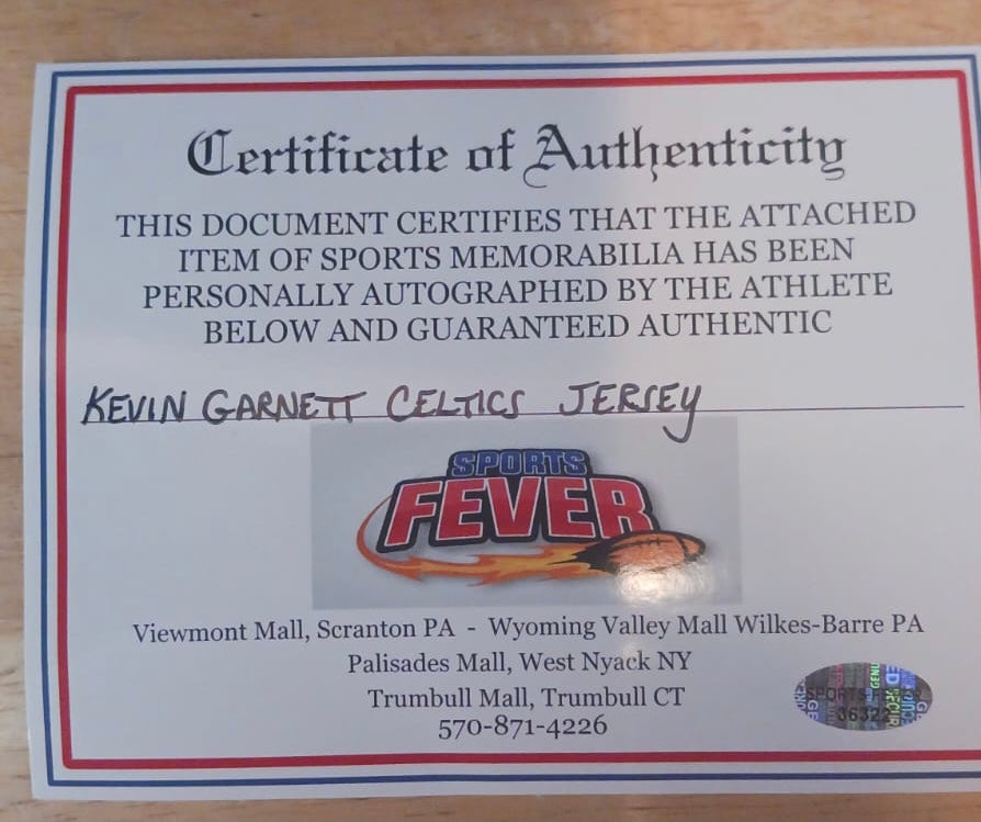 Kevin Garnett autographed Boston Celtics jersey… This jersey is hand signed and comes with a certificate from Sports Fever and a 4x6 photo signing. It is made by Adidas and has stitched on letters and numbers. The jersey is Men’s size XL