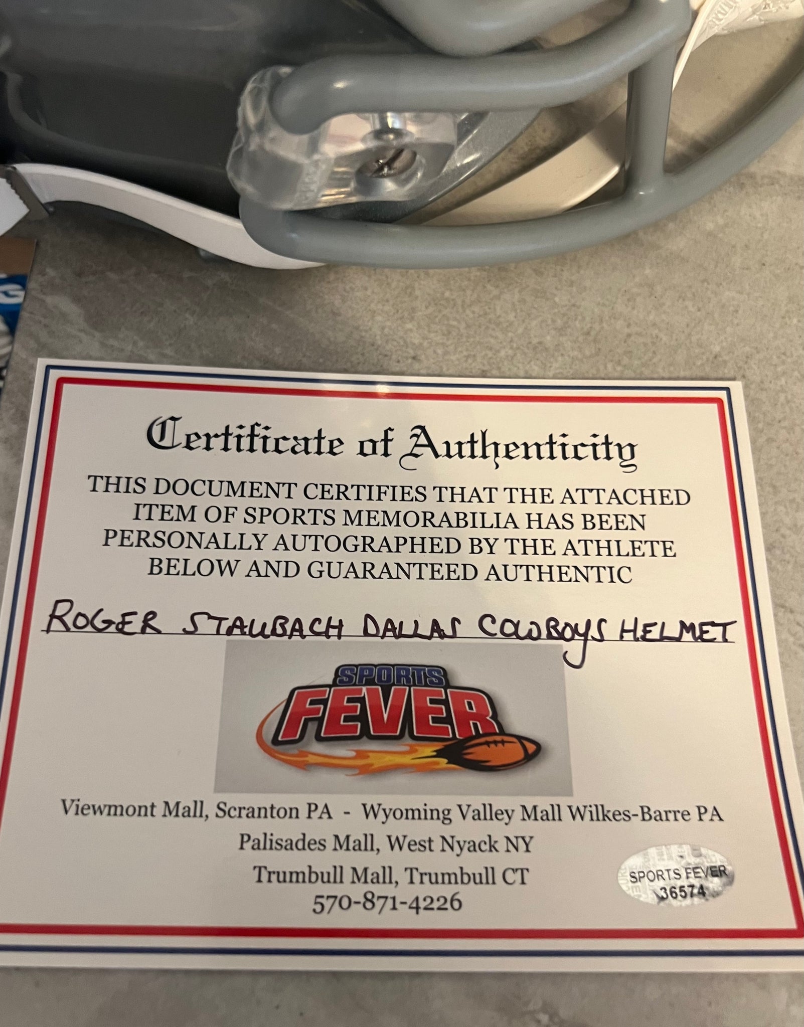 Roger Staubach autographed Dallas Cowboys Full Size replica helmet with Sports Fever COA… This is a hand signed standard size helmet. It also comes with a 4x6 photo of him from the signing. This comes in perfect condition (new in the box)