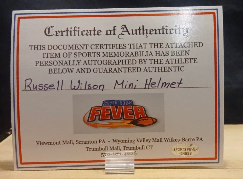 Russell Wilson autographed Pittsburgh Steelers mini helmet with Sports Fever COA… This is a hand signed standard size Riddell Mini helmet. This comes in perfect condition (new in the box)