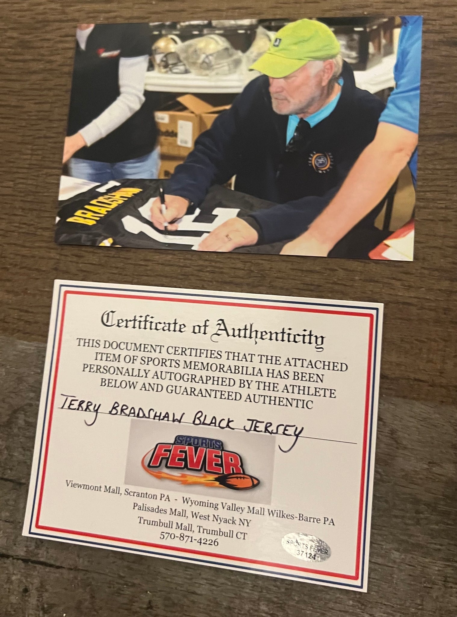 Terry Bradshaw Autographed jersey… Pittsburgh Steelers Hall of Fame Quarterback. … COA Sports Fever and you will also receive a 4x6 photo of Terry Bradshaw signing the jersey. The jersey is size XL and features stitched on letters and numbers. The jersey is made by Classic Authentics and is New/perfect condition